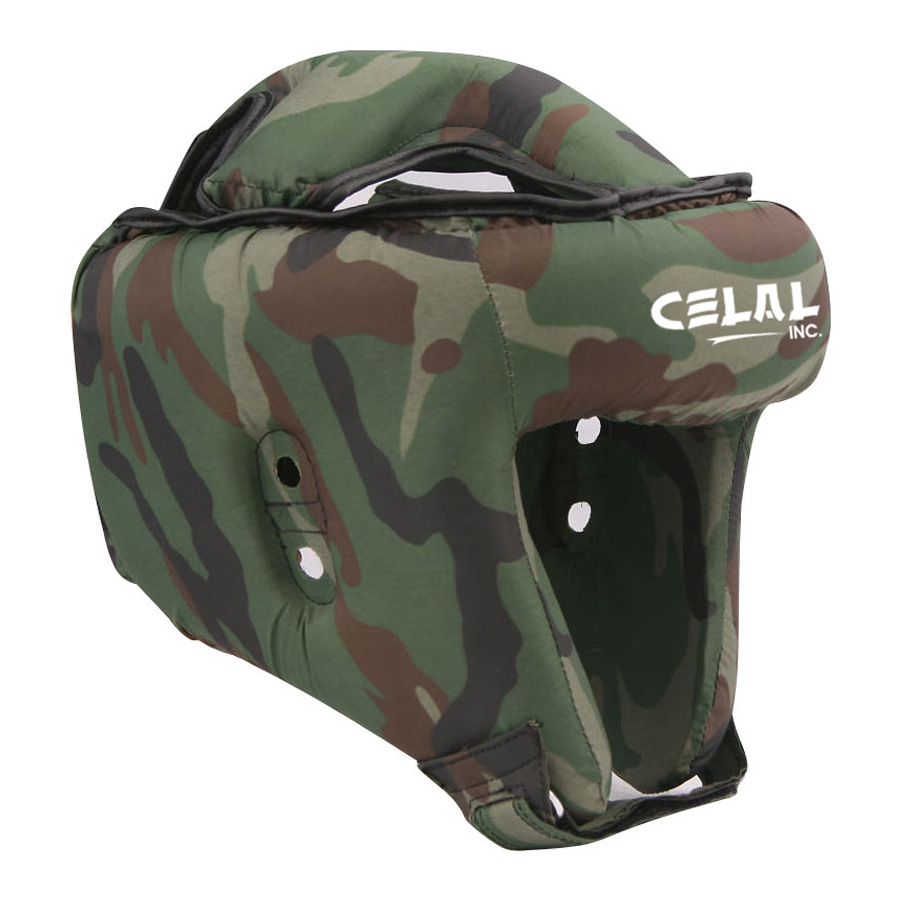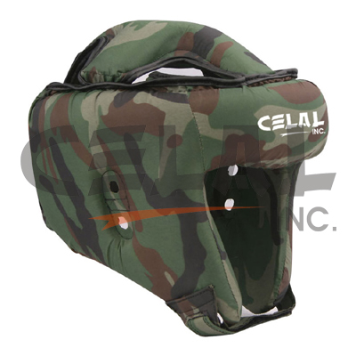 Head guard, constructed of camoflage cordura, inside high density injection mold, with Velcro closure,