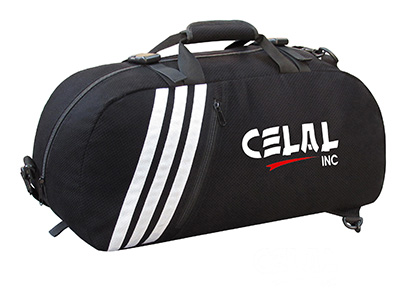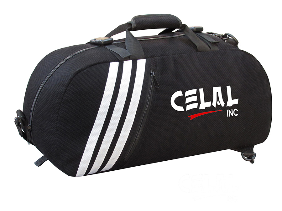 Martial Arts Bag/Backpack "2 in 1" convertible backpack Made of judo cotton cloth with 10 number main zip & 3 stripes on bag, fold able holding handles, both sides external storage pockets, Holding shoulder strap and optional foam padded Back pack straps which can be used optionally and then can be closed in back pockets of bag, Available in all size 62x30x28cm