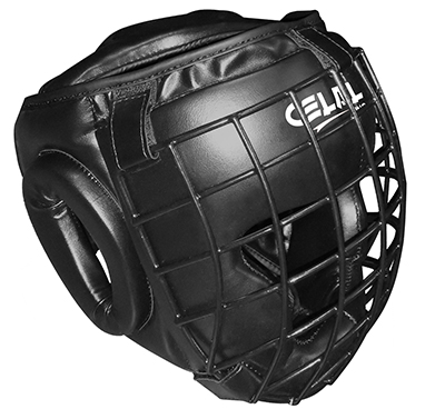 Head guard, constructed of synthetic leather, High density foam padding, Removable steel cage for face protection with Velcro closure, Provides maximum protection during fight & training.